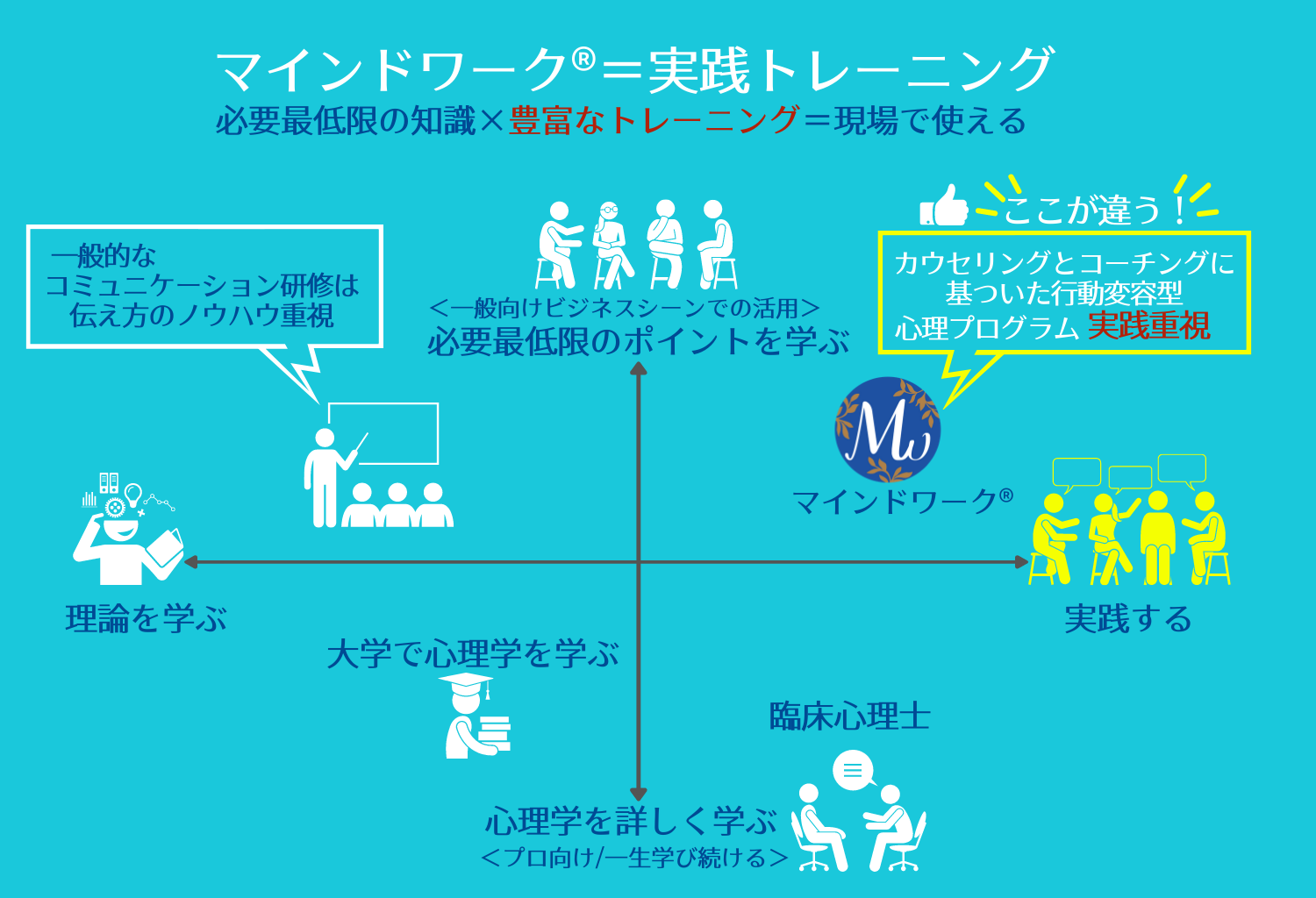 今こうしている私自身が、『マインドワーク』に出会って「ベーシック」から「養成講座」に進み、仕事でも、自己評価でさえも、新たな価値を見出せて新しい道を進み出せた一人です。